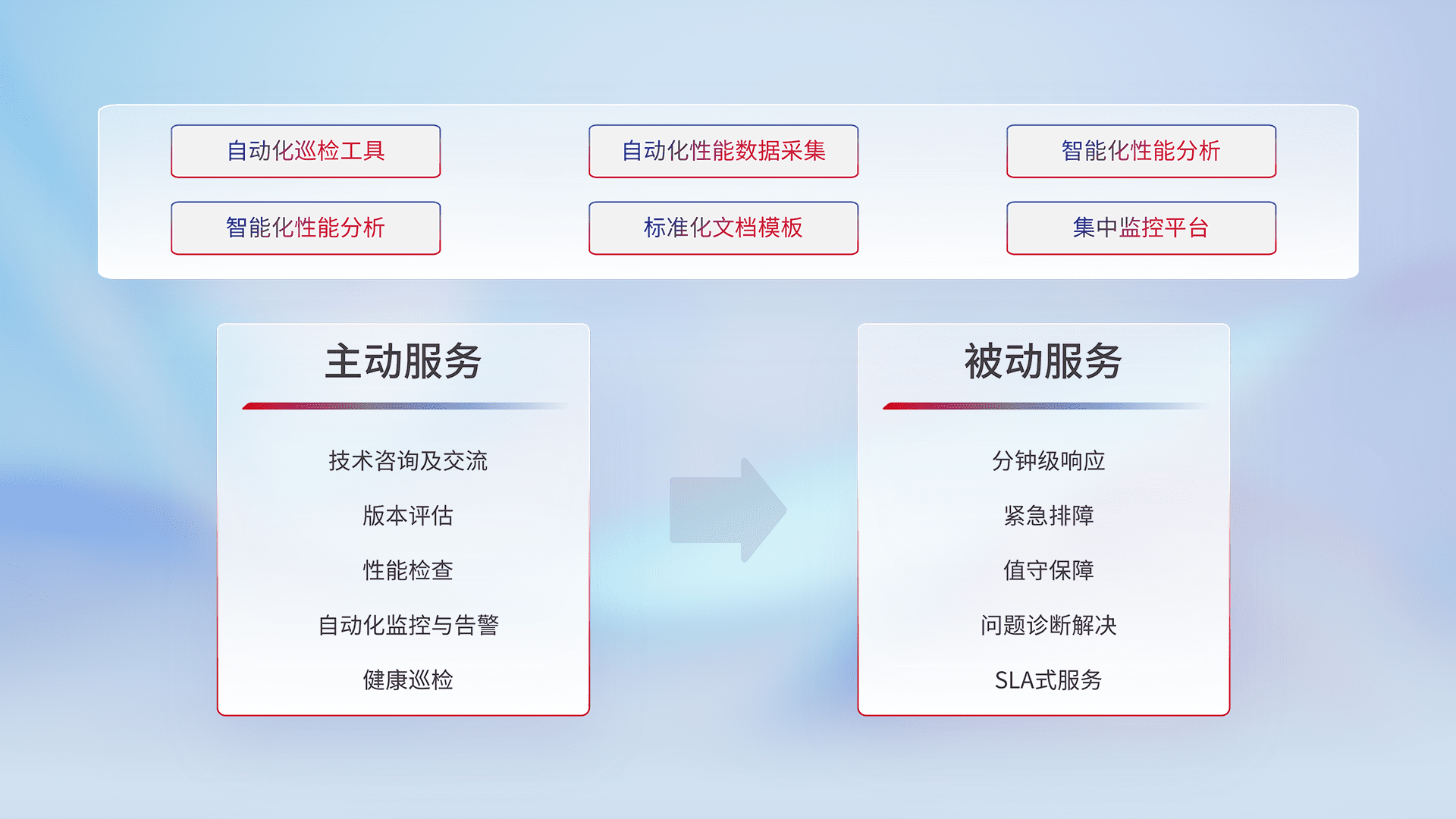 智能化工具和标准化文档,,,保障服务质量,,提供主动服务(包含技术咨询、、、、版本评估、、性能检查、、、自动化监控与告警、、健康巡检)和被动服务包含(分钟级响应、、、、紧急排障、、、、值守保障、、问题诊断解决、、、SLA服务)。。。
